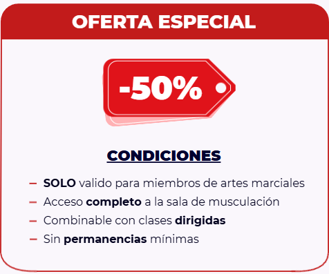 Si estás inscrito en alguna de nuestras disciplinas de artes marciales, obtienes un 50 % de descuento en el abono mensual de la sala de musculación.